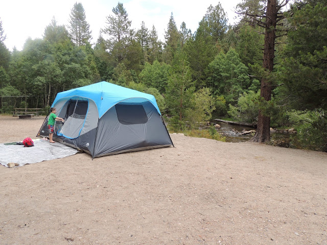 As you can see in the background of the first picture, our first campsite was beside a lake - which was w-a-y too cold to swim in. Rylee, however, found some floating rocks (No, REALLY! Floating rocks!), and we were all impressed by those floating rocks!. But we found a place closer to the entrance of Yosemite and closer to a town for re-supplying. There weren't many campsites available by the river, but we kept looking until we found a HUGE site right on the river. Wow! We snagged that one!